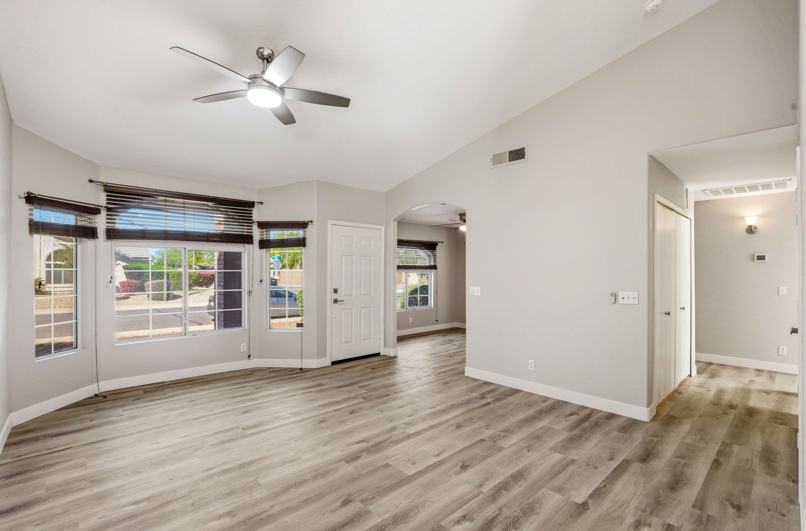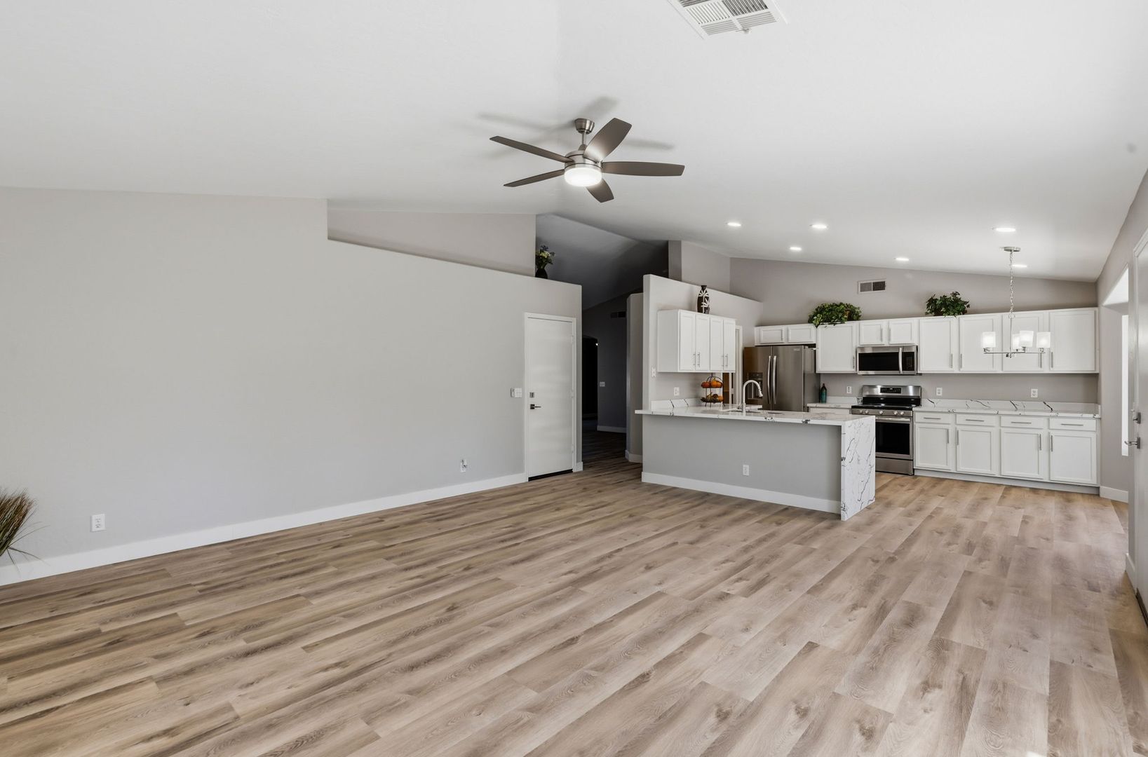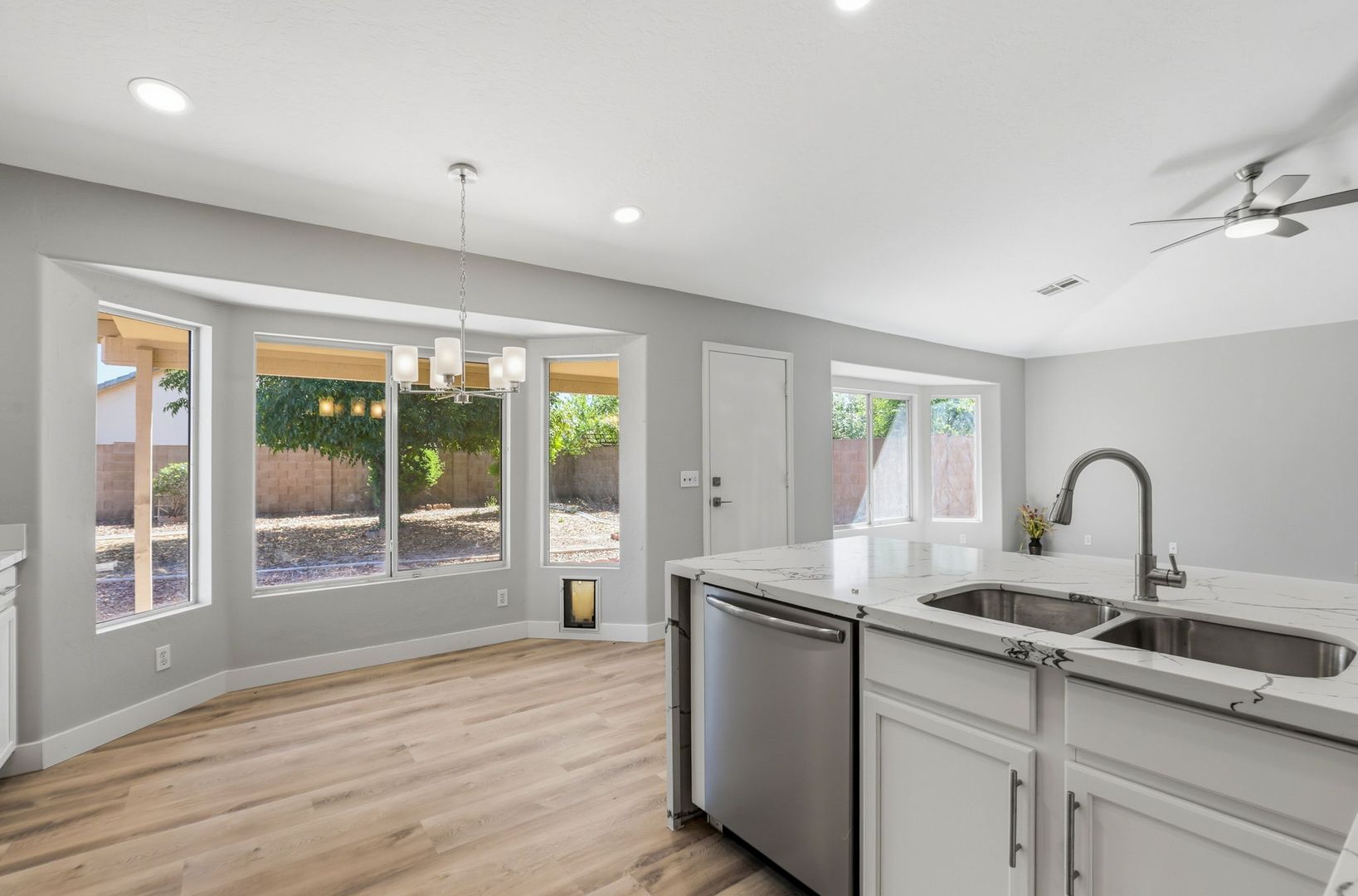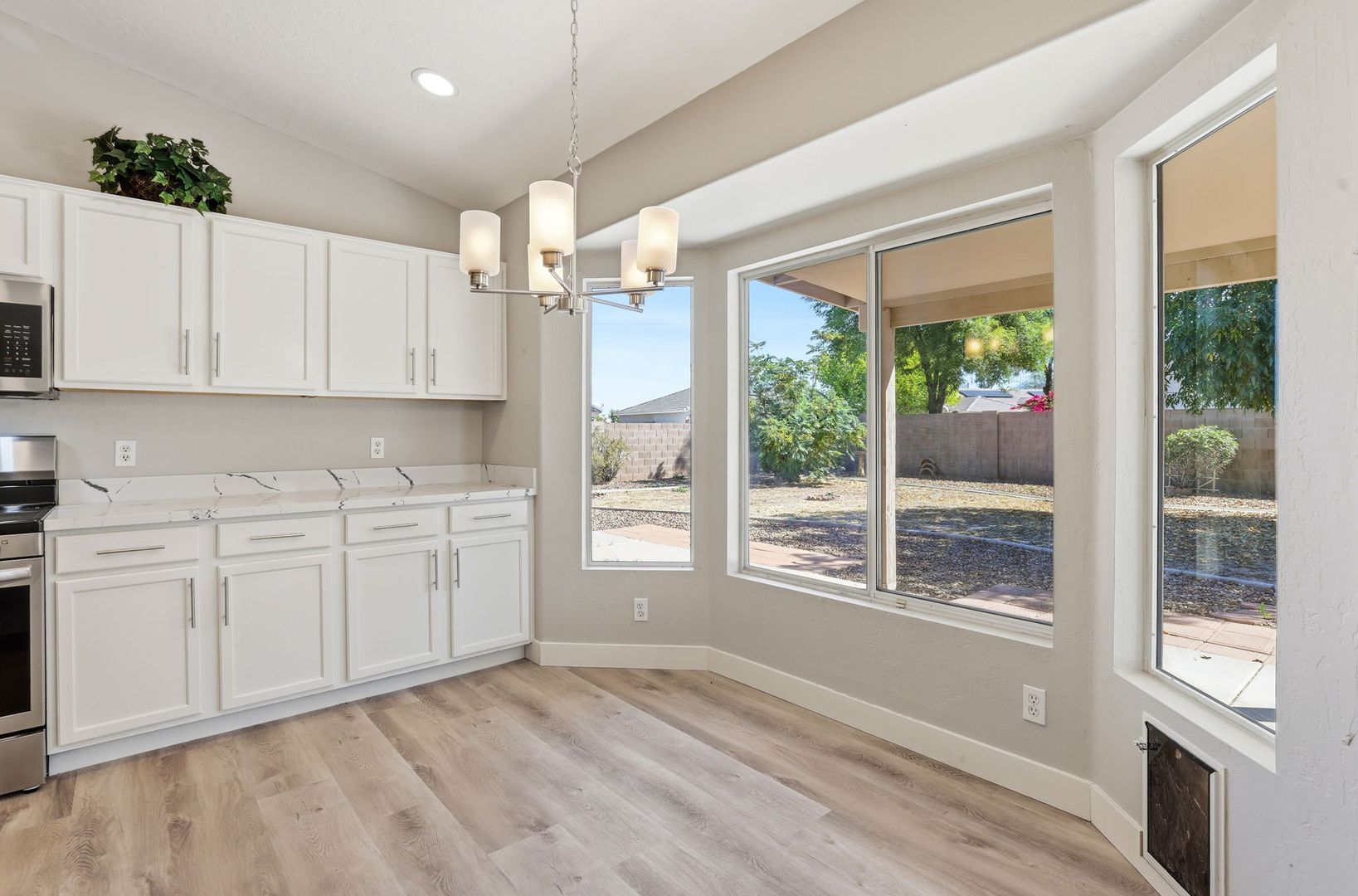 Stunning, fully remodeled 3-bedroom plus den corner-lot home in a great Gilbert location. This single-level home offers about 1,693 sq ft with an open great room, vaulted ceilings, and elegant LVP flooring throughout for a clean, modern look. The updated kitchen features high-end stainless steel appliances, quartz countertops with a waterfall edge, and stylish finishes that flow into the dining and living areas. The spacious primary suite includes a beautifully redesigned bath and walk-in closet, with two additional bedrooms plus a den ideal for an office or flex space. Outside, enjoy a large lot with mature trees and plenty of room to relax or entertain, just minutes from SanTan Village, restaurants, and quick freeway access.