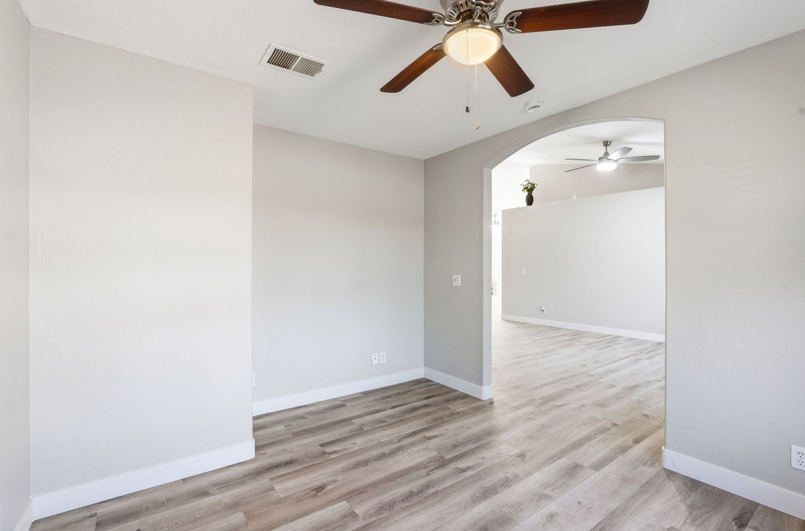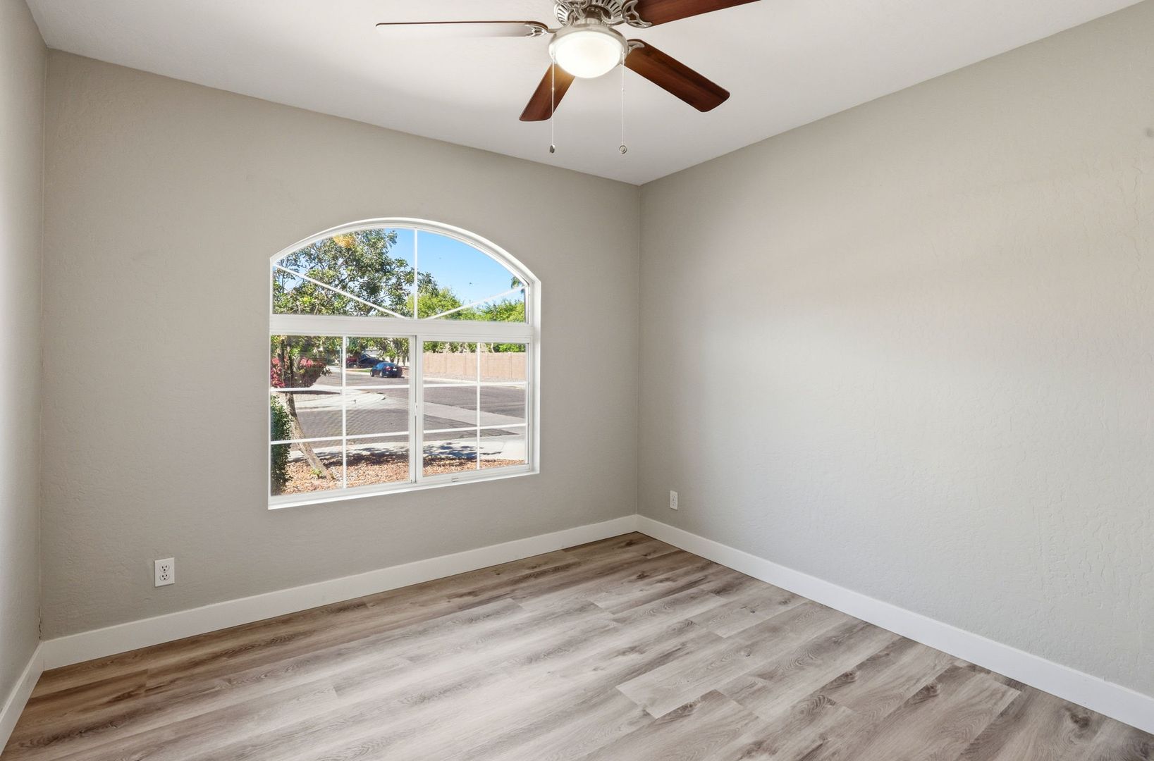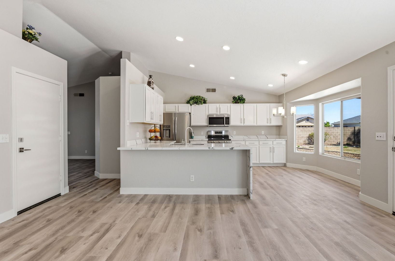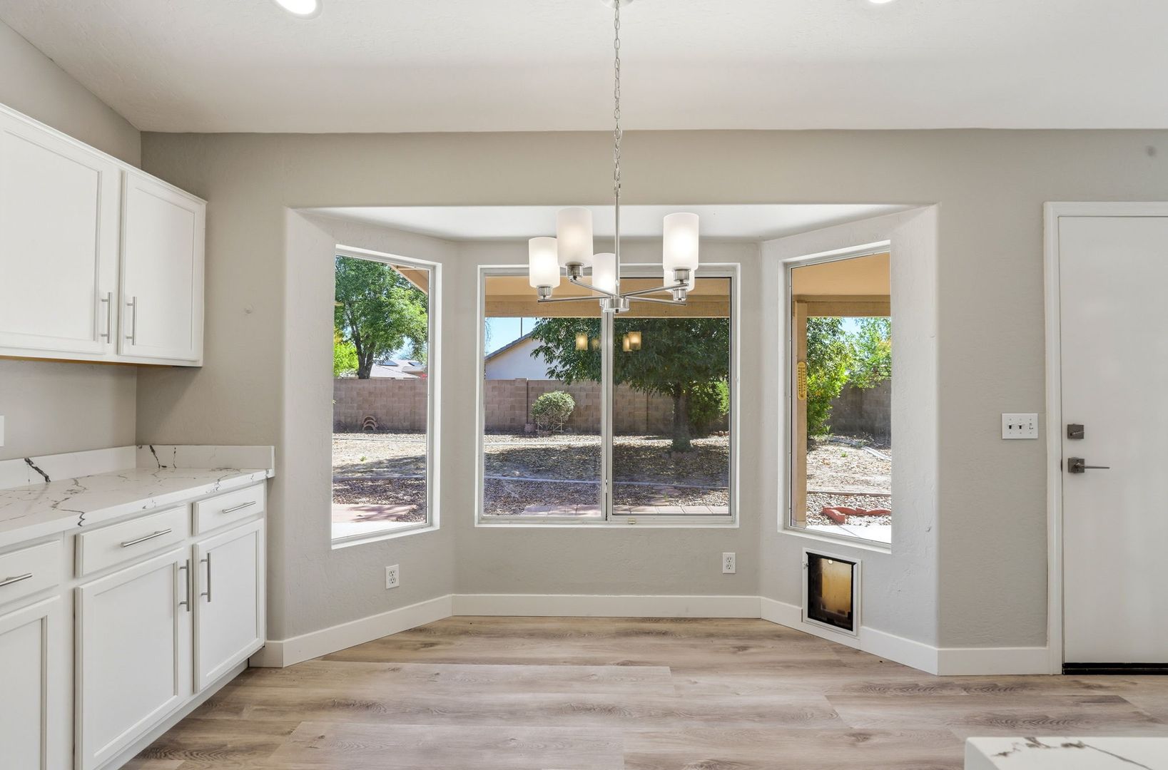 Stunning, fully remodeled 3-bedroom plus den corner-lot home in a great Gilbert location. This single-level home offers about 1,693 sq ft with an open great room, vaulted ceilings, and elegant LVP flooring throughout for a clean, modern look. The updated kitchen features high-end stainless steel appliances, quartz countertops with a waterfall edge, and stylish finishes that flow into the dining and living areas. The spacious primary suite includes a beautifully redesigned bath and walk-in closet, with two additional bedrooms plus a den ideal for an office or flex space. Outside, enjoy a large lot with mature trees and plenty of room to relax or entertain, just minutes from SanTan Village, restaurants, and quick freeway access.