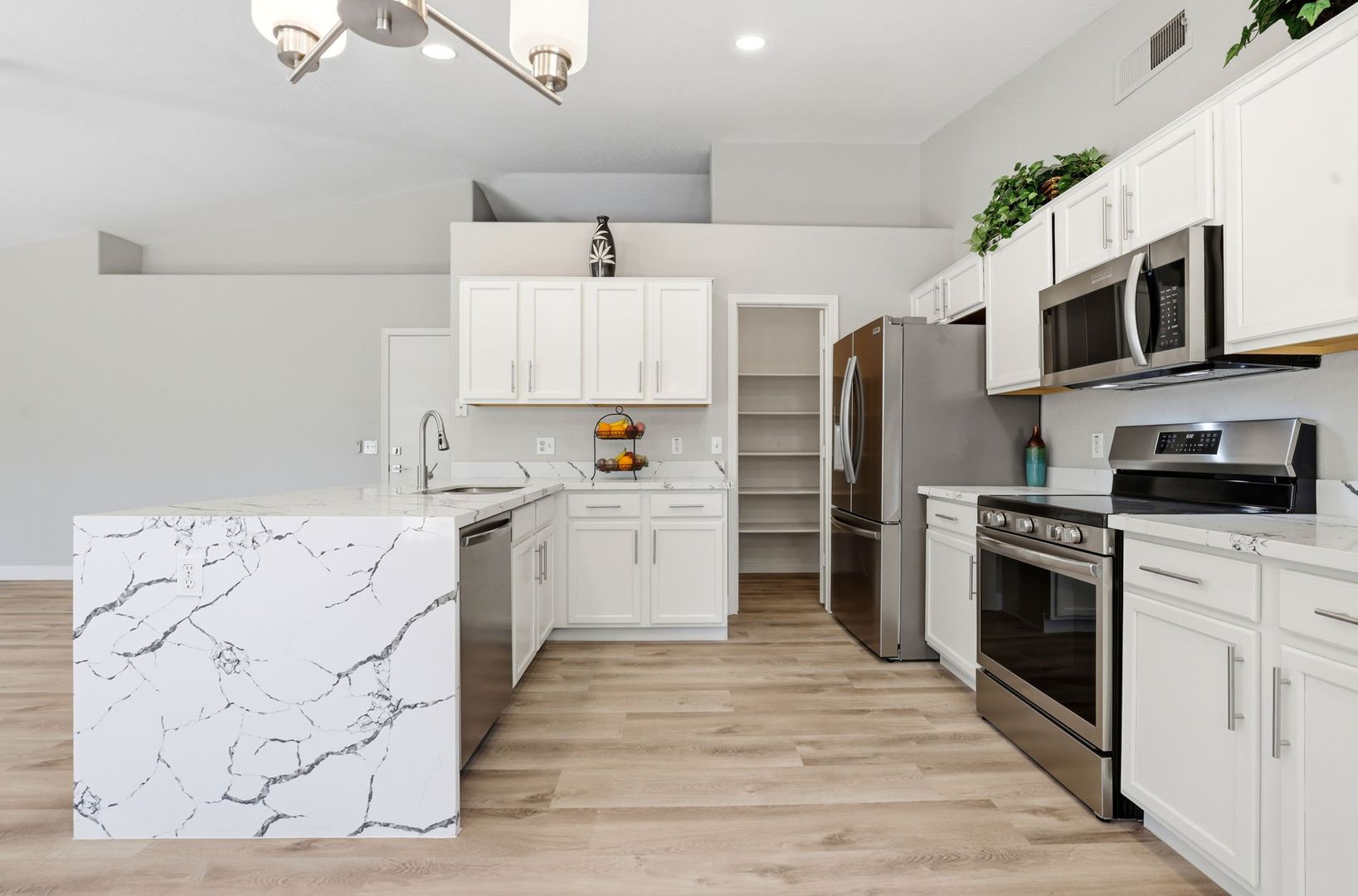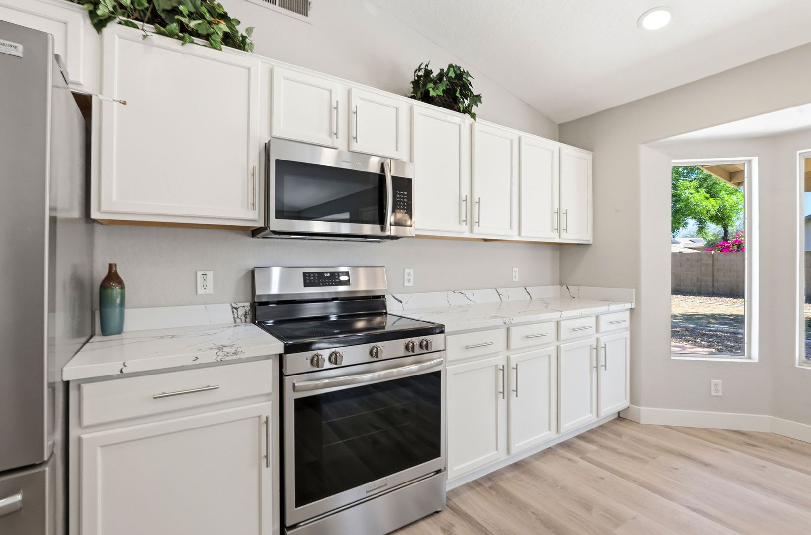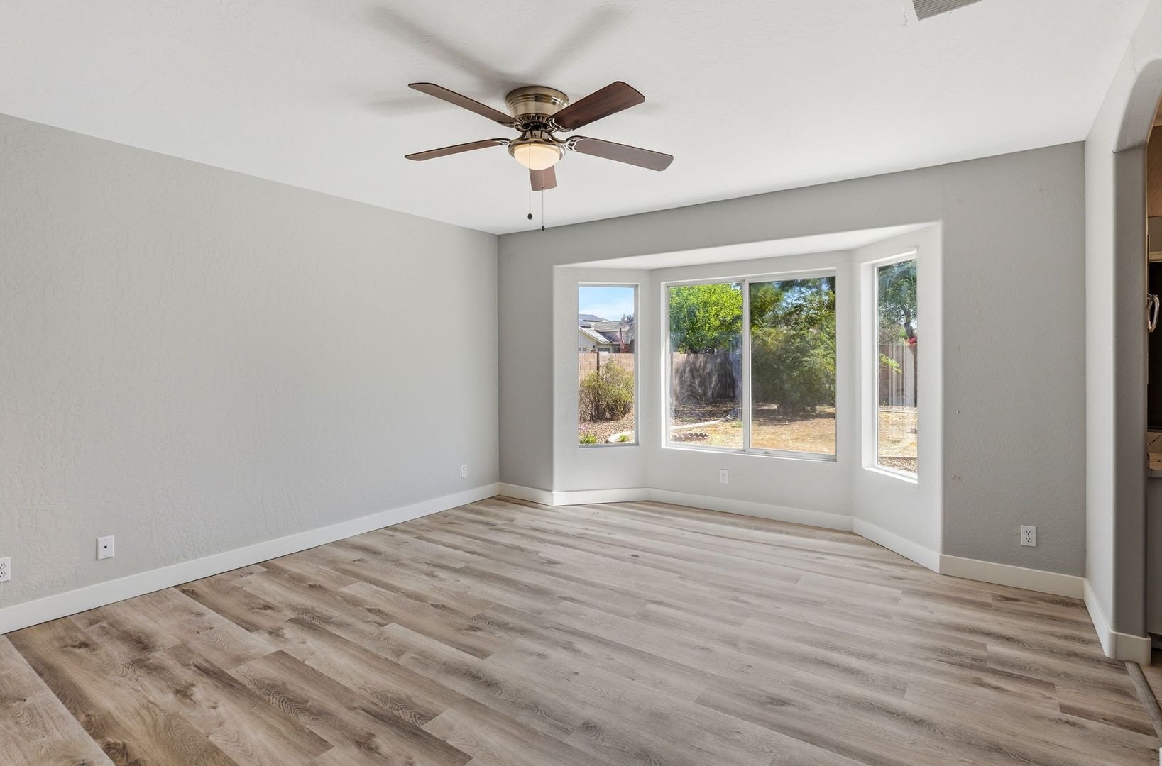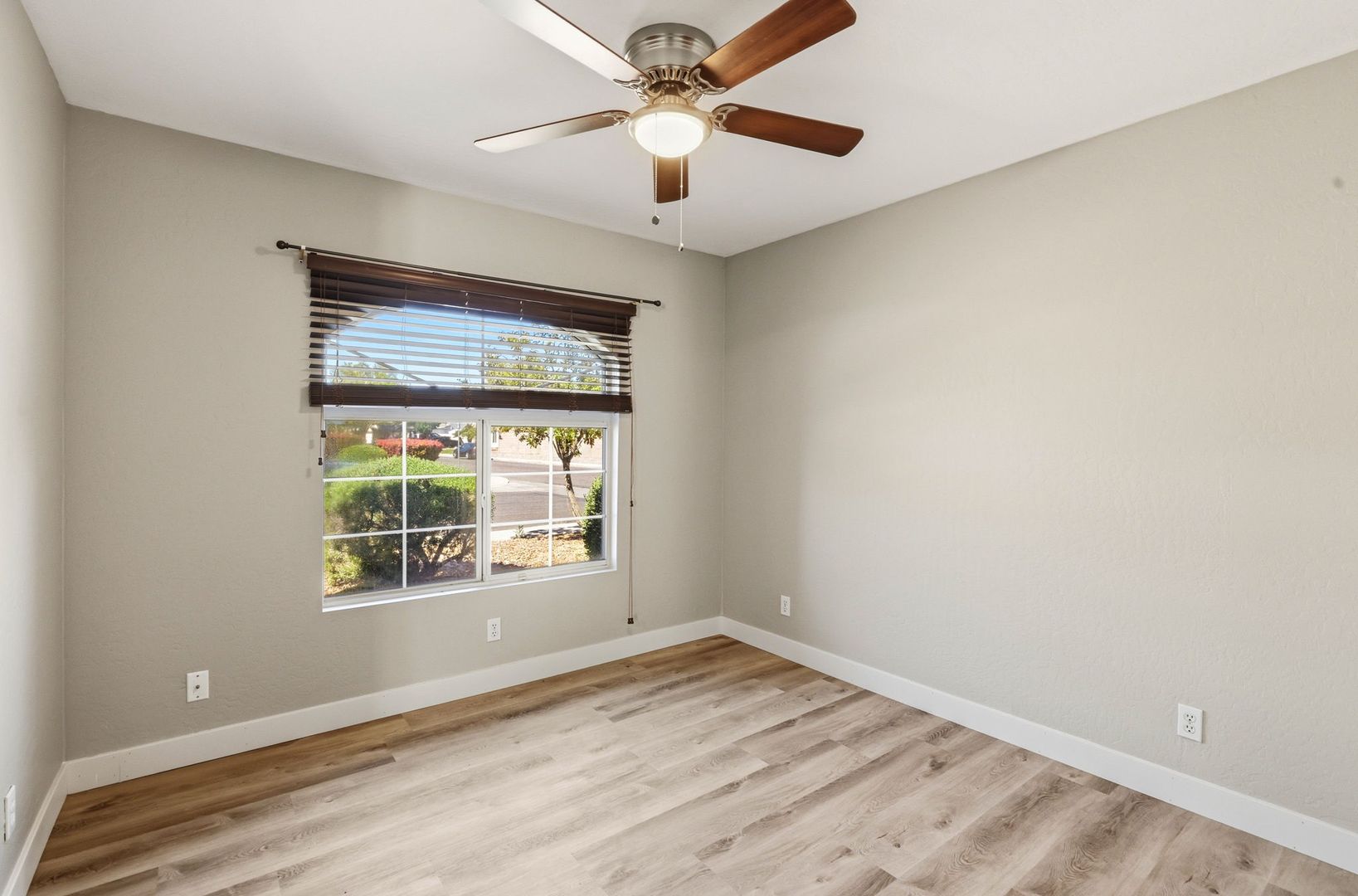 Stunning, fully remodeled 3-bedroom plus den corner-lot home in a great Gilbert location. This single-level home offers about 1,693 sq ft with an open great room, vaulted ceilings, and elegant LVP flooring throughout for a clean, modern look. The updated kitchen features high-end stainless steel appliances, quartz countertops with a waterfall edge, and stylish finishes that flow into the dining and living areas. The spacious primary suite includes a beautifully redesigned bath and walk-in closet, with two additional bedrooms plus a den ideal for an office or flex space. Outside, enjoy a large lot with mature trees and plenty of room to relax or entertain, just minutes from SanTan Village, restaurants, and quick freeway access.
