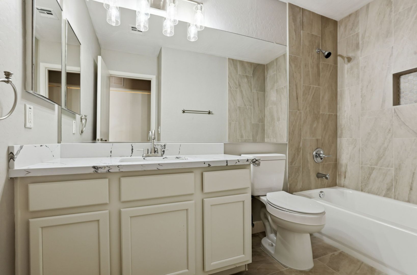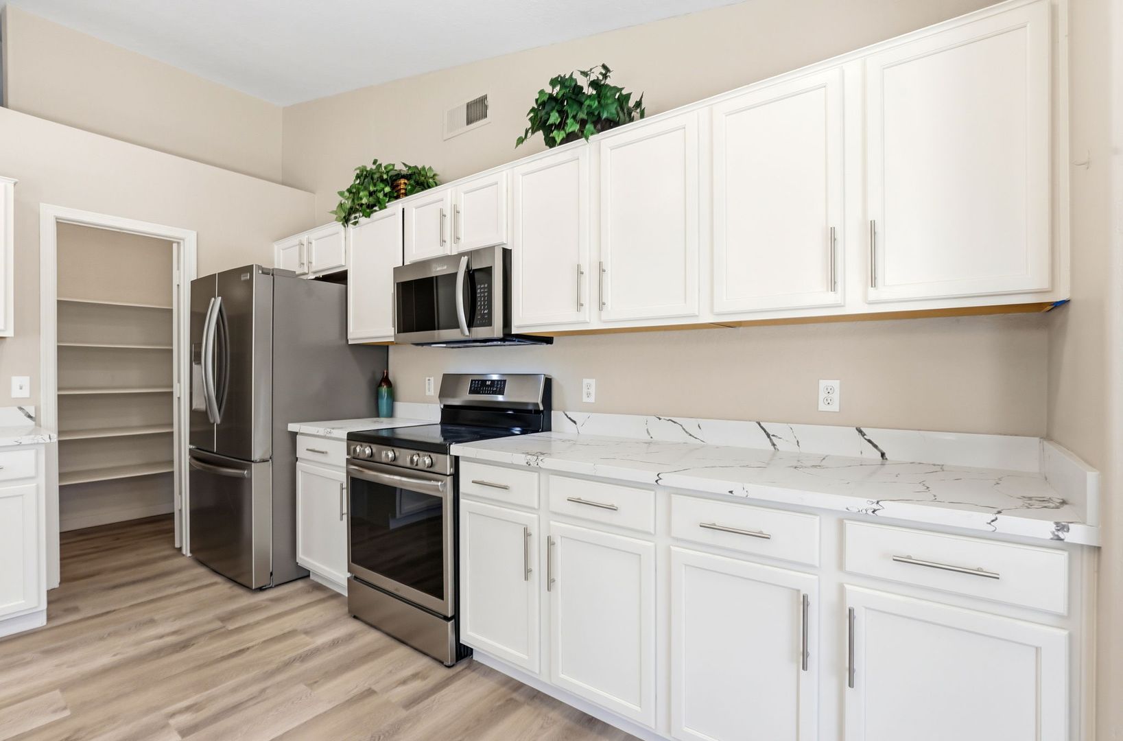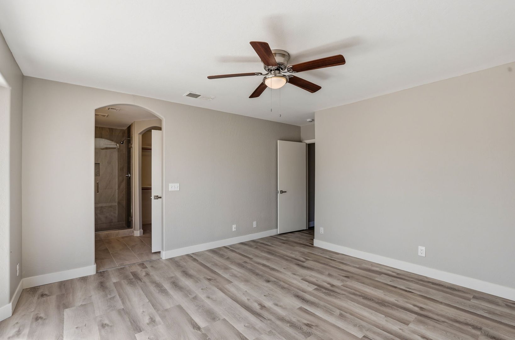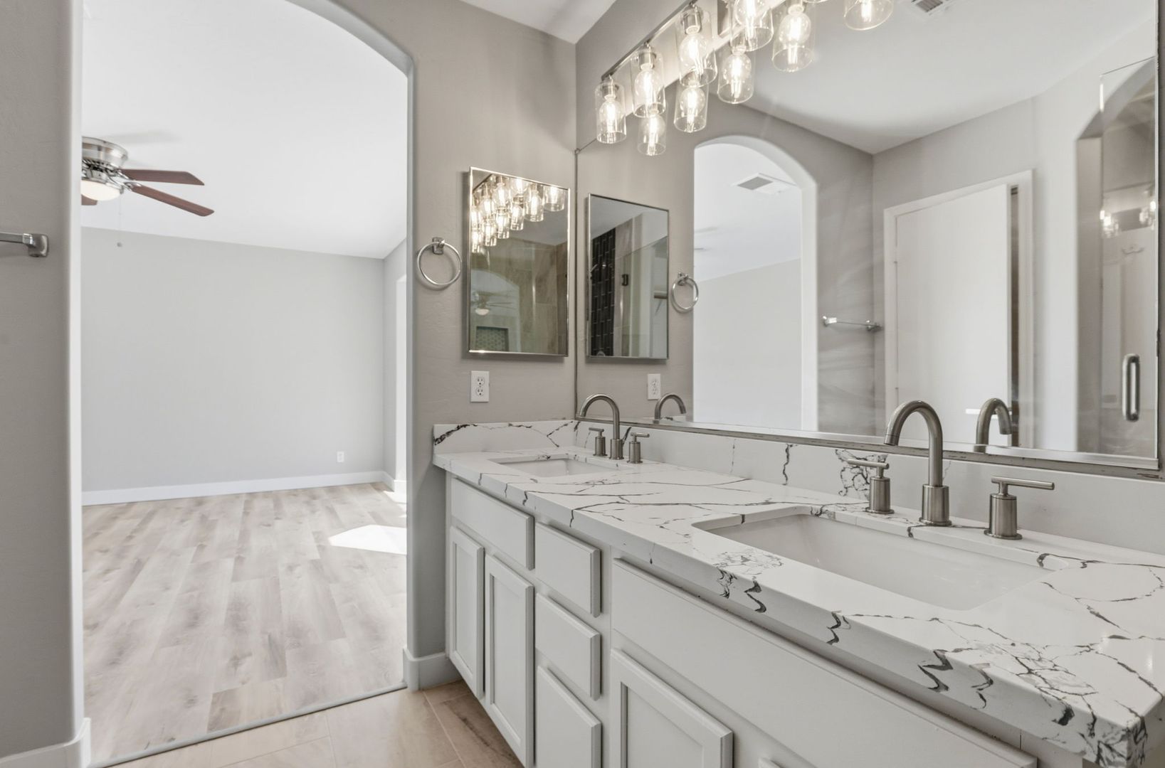 Stunning, fully remodeled 3-bedroom plus den corner-lot home in a great Gilbert location. This single-level home offers about 1,693 sq ft with an open great room, vaulted ceilings, and elegant LVP flooring throughout for a clean, modern look. The updated kitchen features high-end stainless steel appliances, quartz countertops with a waterfall edge, and stylish finishes that flow into the dining and living areas. The spacious primary suite includes a beautifully redesigned bath and walk-in closet, with two additional bedrooms plus a den ideal for an office or flex space. Outside, enjoy a large lot with mature trees and plenty of room to relax or entertain, just minutes from SanTan Village, restaurants, and quick freeway access.