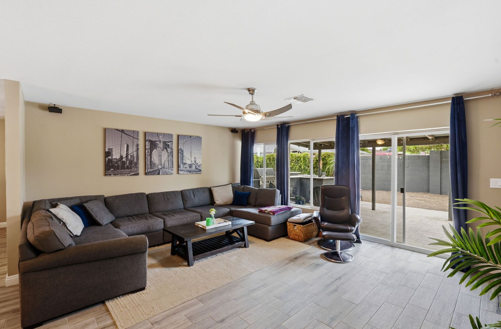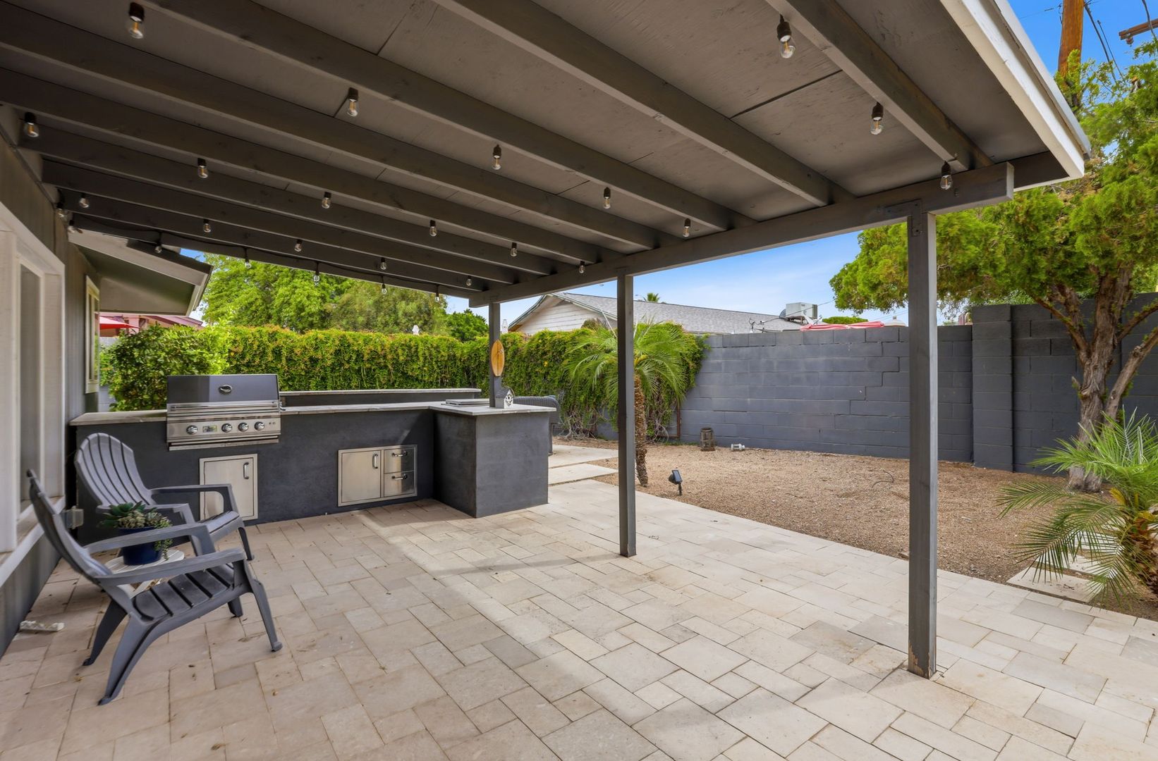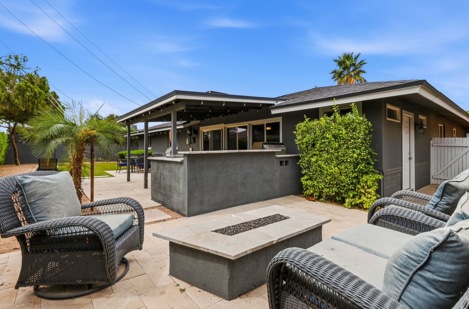 This truly accentuates the positive of living in such a prime location. An open layout highlights practicality and fresh finishes. Blended great room is perfect for relaxing, entertaining or hanging with family or friends. Ultra functional kitchen appointed with all the expected updates. Comfortable sleeping quarters feature updated bathrooms. Enjoy desert living with a Private Backyard complete with BBQ, gas firepit and grassy play areas. Indoor Laundry, One car garage. Minutes from schools, Chaparral Park, Spring training, Golf and Shopping.