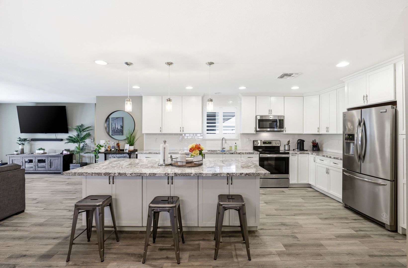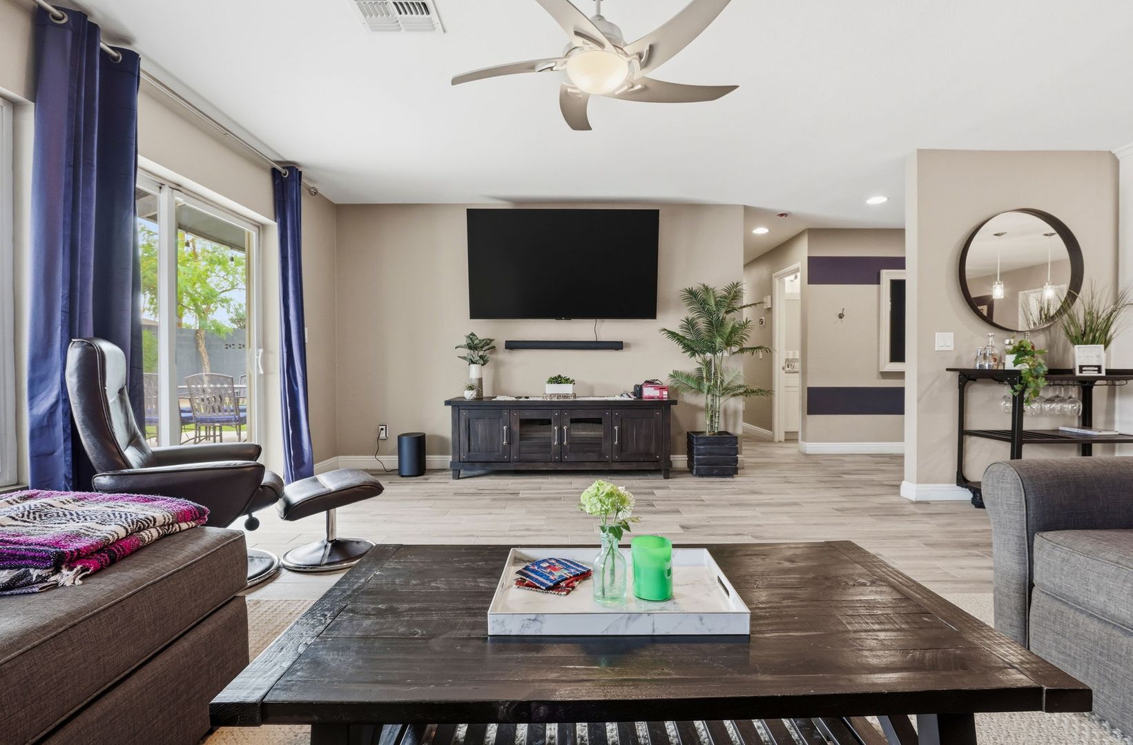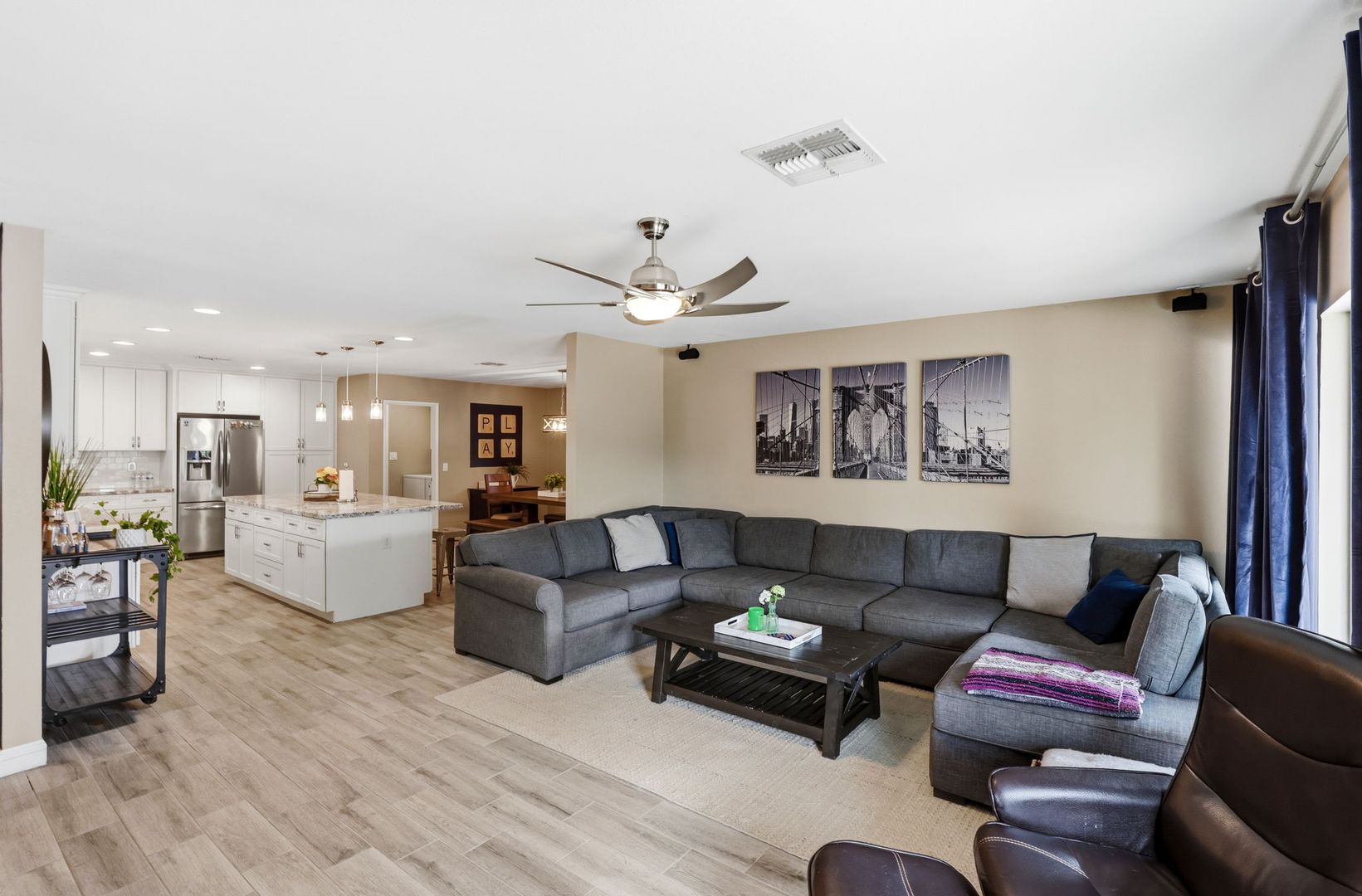 This truly accentuates the positive of living in such a prime location. An open layout highlights practicality and fresh finishes. Blended great room is perfect for relaxing, entertaining or hanging with family or friends. Ultra functional kitchen appointed with all the expected updates. Comfortable sleeping quarters feature updated bathrooms. Enjoy desert living with a Private Backyard complete with BBQ, gas firepit and grassy play areas. Indoor Laundry, One car garage. Minutes from schools, Chaparral Park, Spring training, Golf and Shopping.