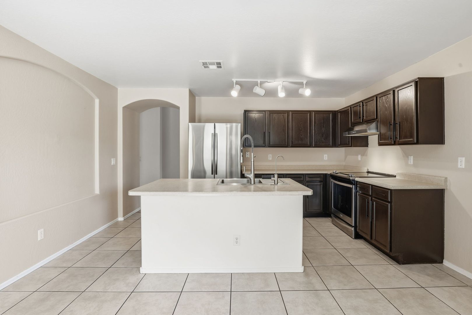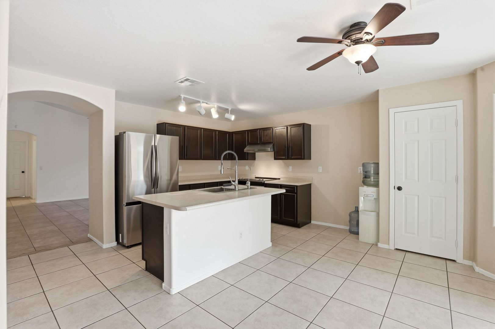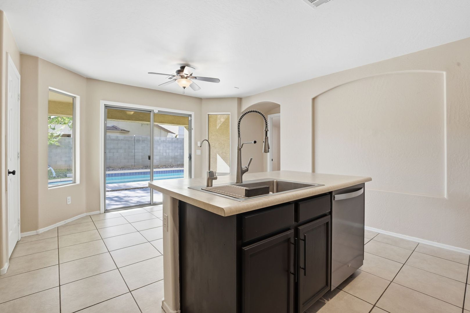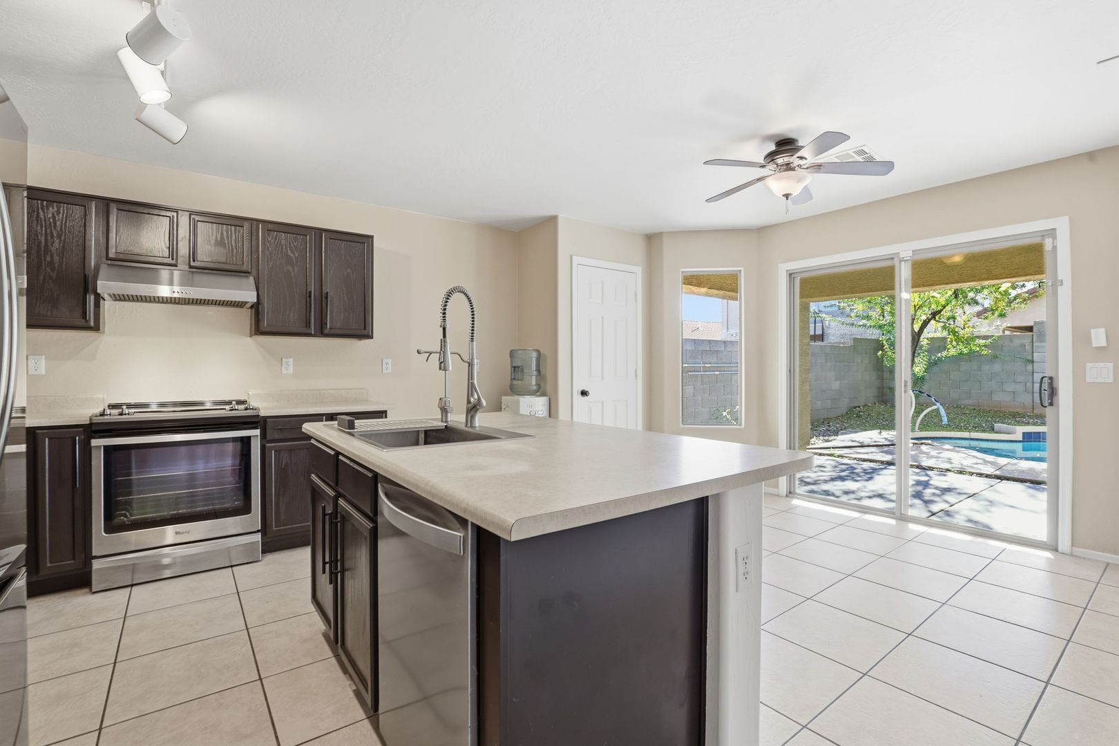 This charming 4 bed 2 bath home with a pool in San Tan Heights has everything you need! The kitchen features an island with a dishwasher, refrigerator, electric stove/oven, and plenty of cabinet space. The flooring throughout is tile, and the bedrooms are laminate. The master features double sinks and a walk-in closet. This home has been a very well cared for home. Come see today!