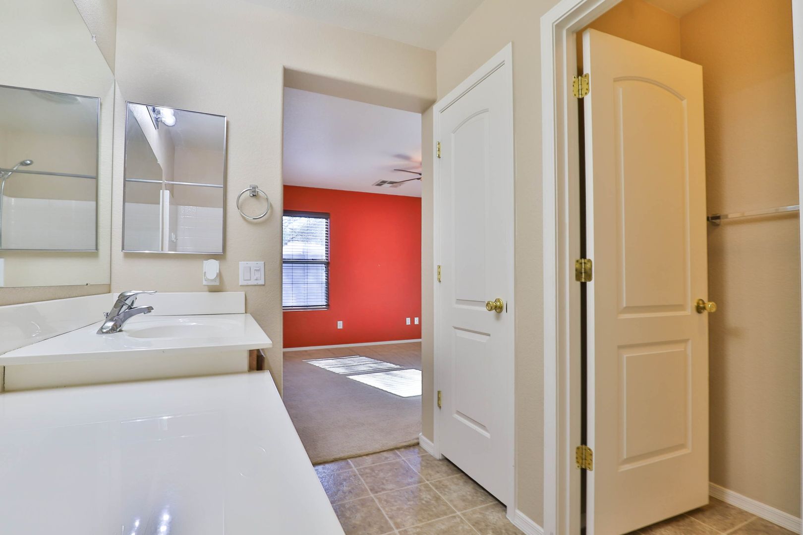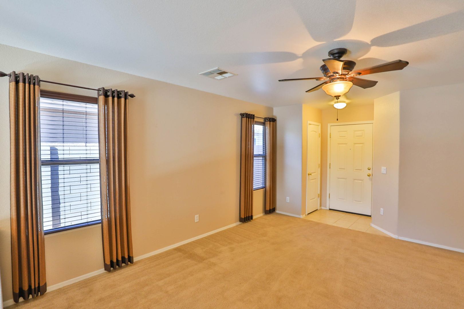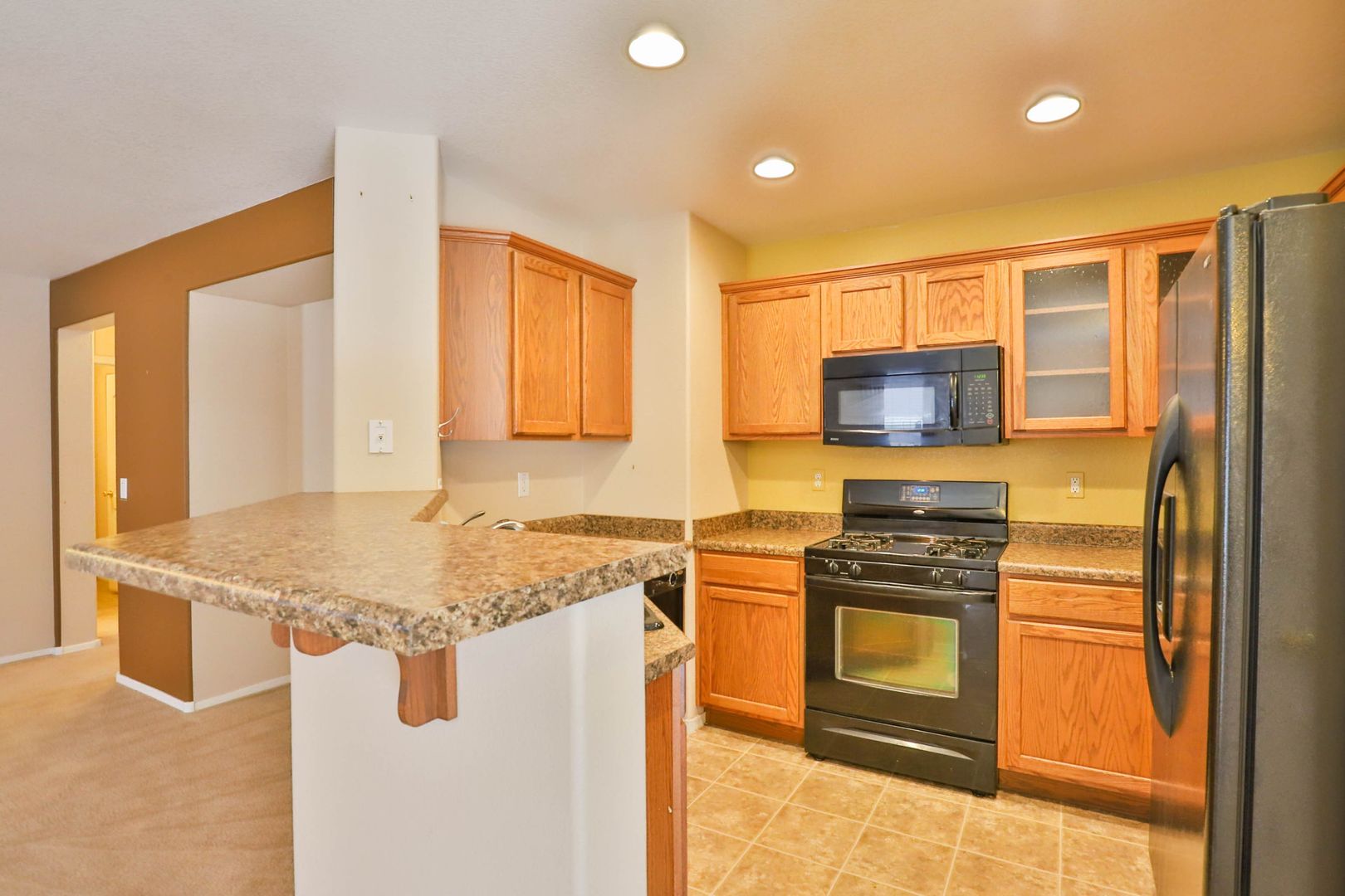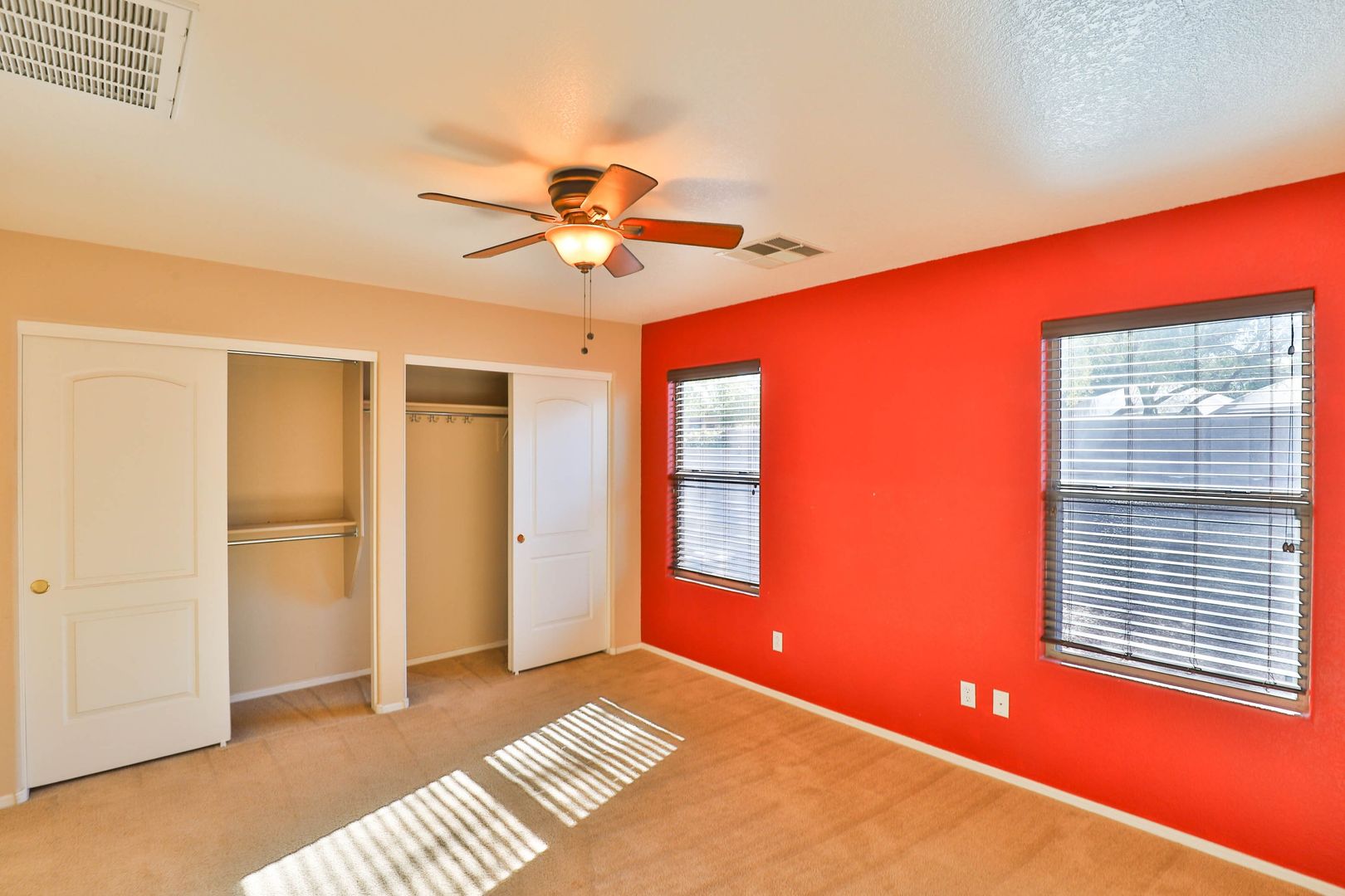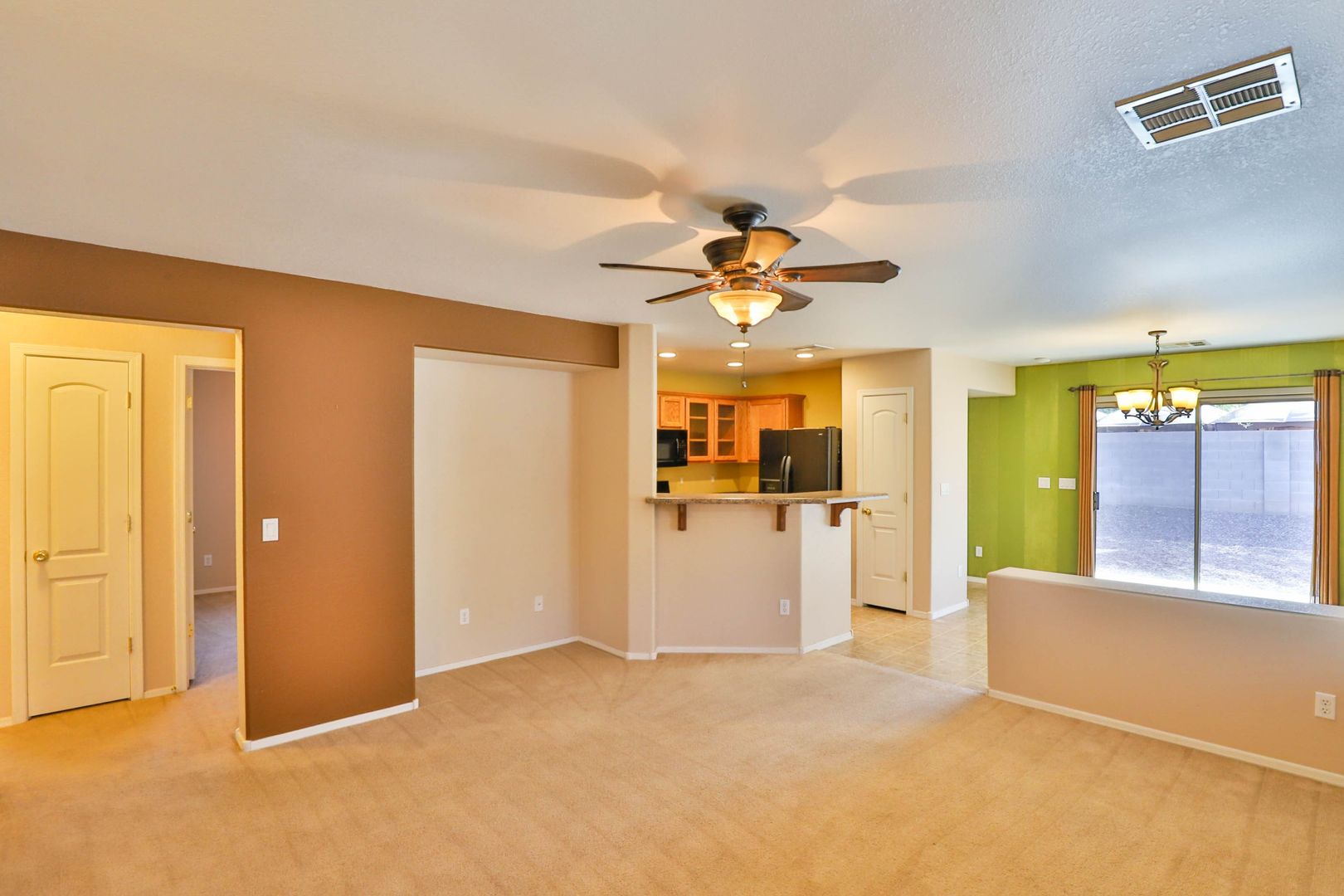 Do not miss this wonderful 3 bedroom / 2 bathroom home with two car garage. Enter and find a split floor plan with two-tone paint, carpet/tile flooring, and comfortable living. The kitchen comes complete with appliances including refrigerator, upgraded countertops, and a breakfast bar! The master bedroom features an attached full bathroom with upgraded countertops. Step outside to find a covered patio and low maintenance desert landscaping. 1 MONTH FREE WITH A 13 MONTH LEASE!
